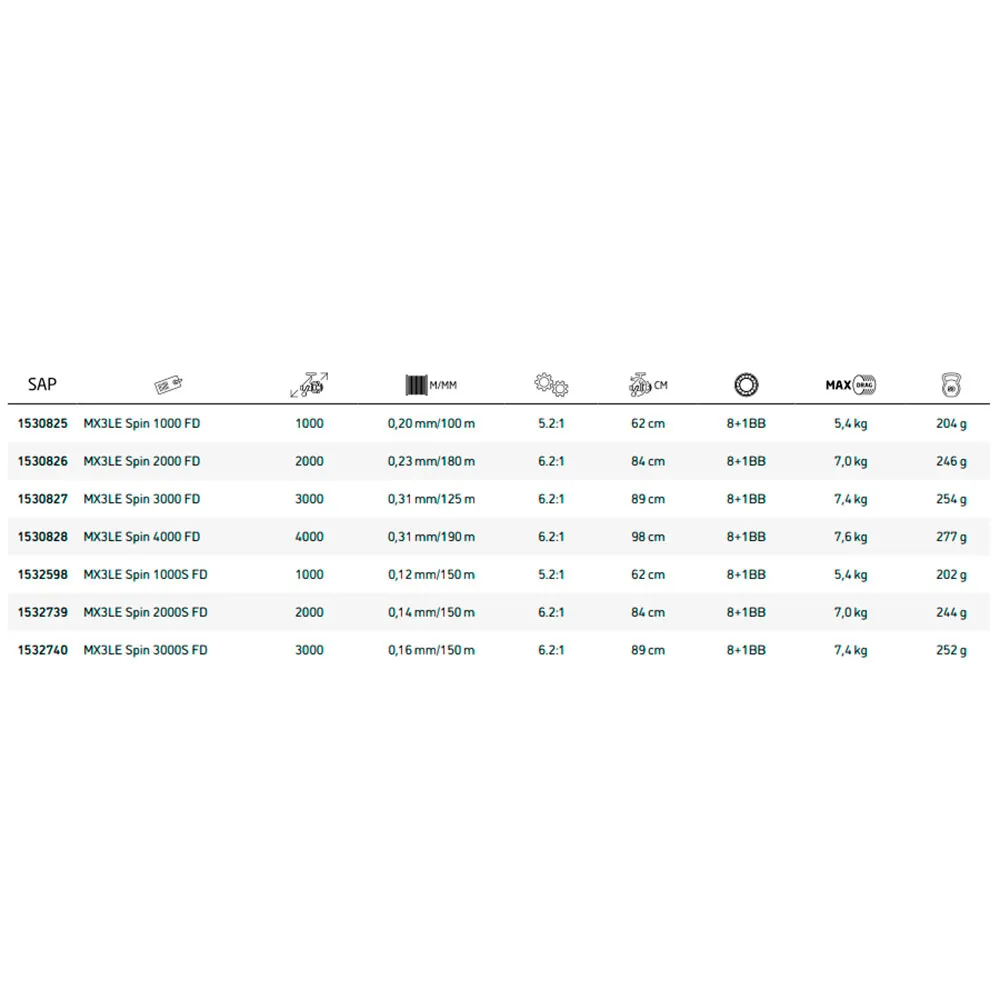 The MX3LE reel is equipped with a light weight graphite body and rotor design, has 8+1 bearings(!) and that results in a super smooth rotation. Furthermore, the reel has an extra rigid bail, ergonomic special rubber grip handle knob and foldable handle (easy for transport / storage). The MX3LE feels very solid, lightweight and has an unbelievable smooth rotation: it looks, feels and fishes unbelievably well for a reel of this price.